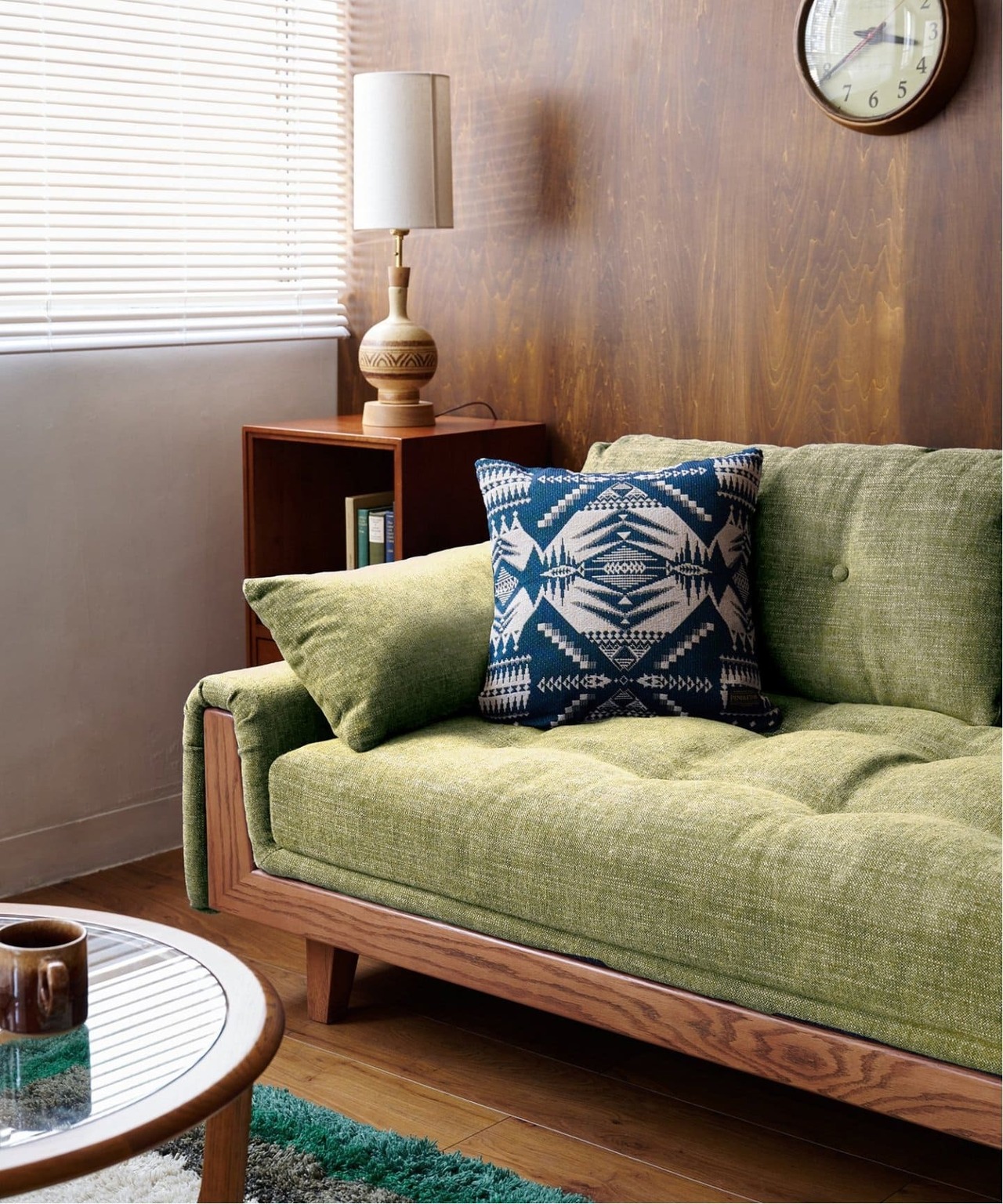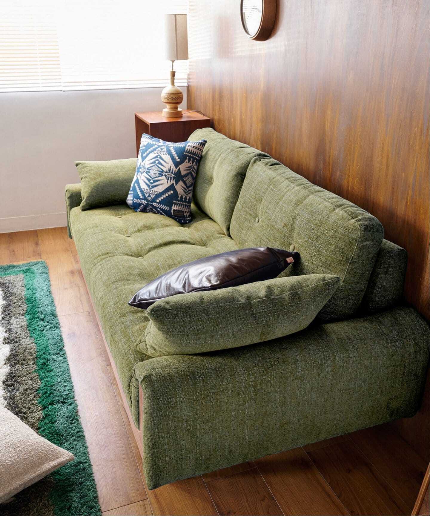 内側にはめ込んだ木フレームと、全体をファブリックで包み込んだようなデザインが特徴的な【WINDAN Feather SOFA】